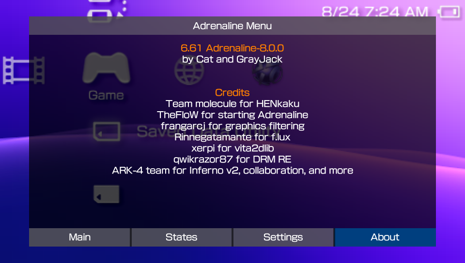 Codestationfor his incredible work improving CSO speeds and creating the ZSO format.UnkownBrackets(maxcso) for creating the CSOv2 format.Cat(aka.isage) for everything that he has done for Adrenaline and continued improving it along the way.GrayJackfor everything that they have done for Adrenaline and help Cat maintain it.- Every other giant shoulder we are standing on.