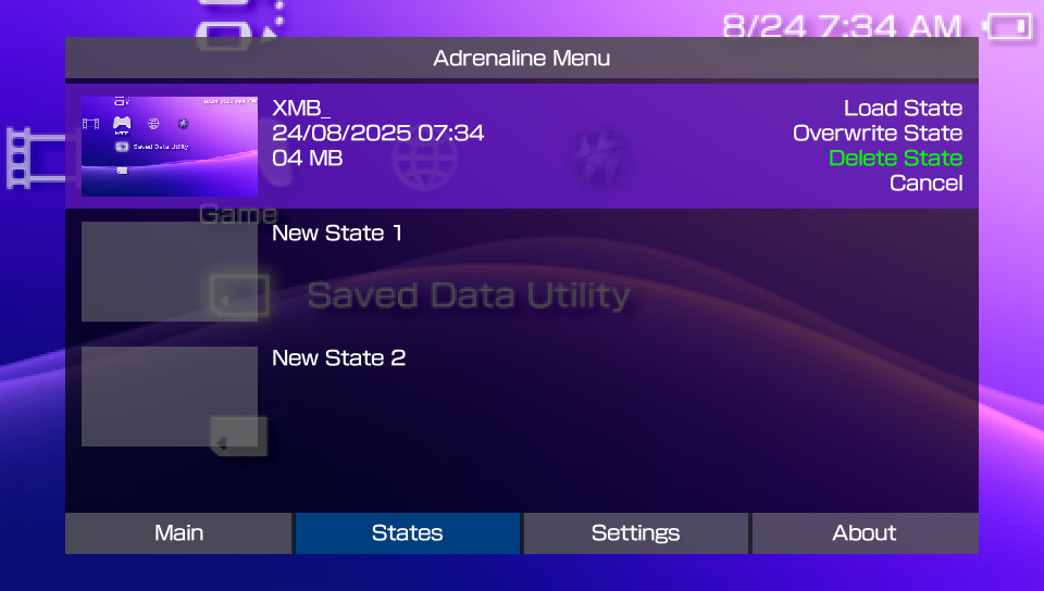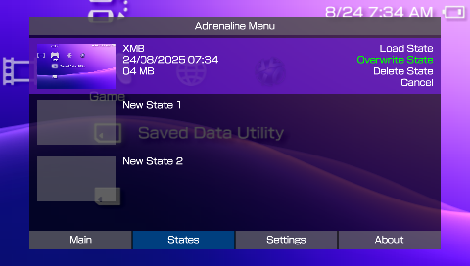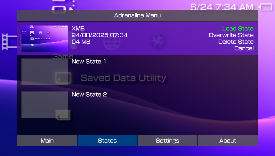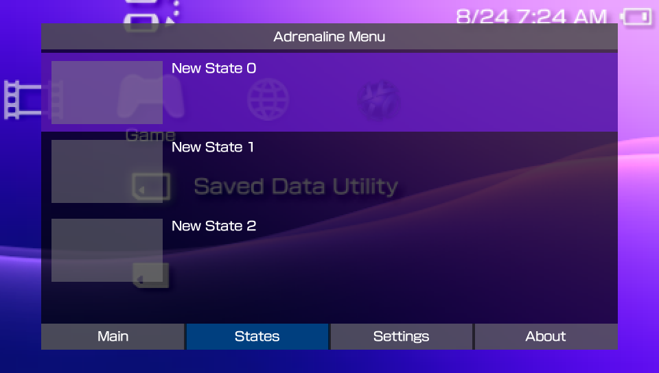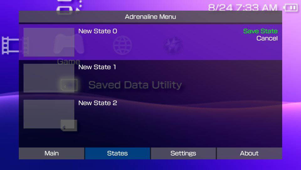 This tab has the front UI for the native save state feature of Adrenaline. You can find more information on this feature on the Save State page.