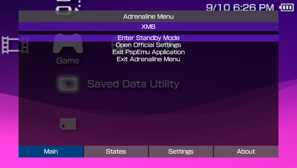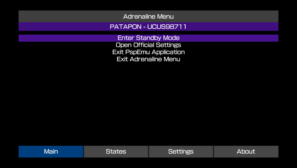 Enter Standby Mode: Make the system enter standby modeOpen Official Settings: Opens the official PSVita/PSTV PSPemu game settingsExit PspEmu Application: Exits the applicationExit Adrenaline Menu: Closes the menu
