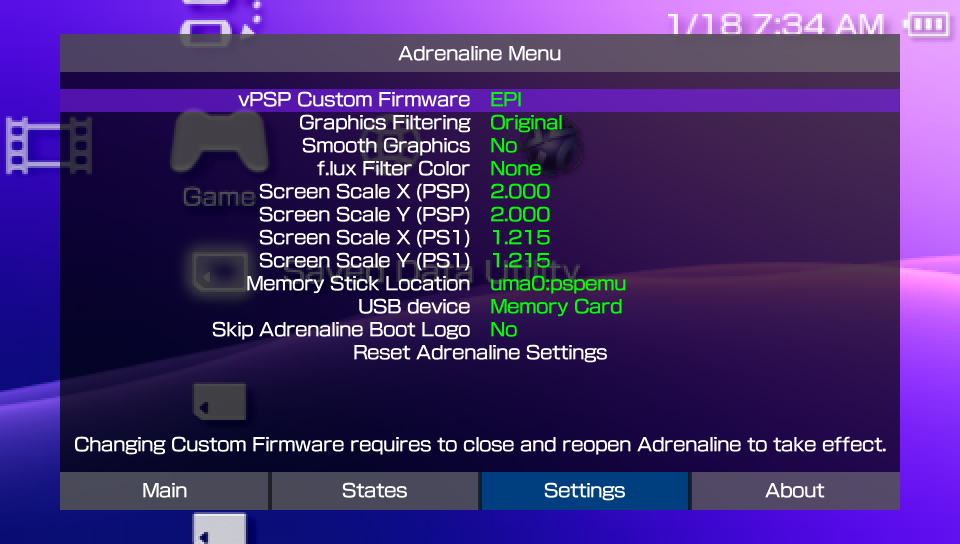 - Added ability to save and load states using the ‘States’ tab in the Adrenaline menu.